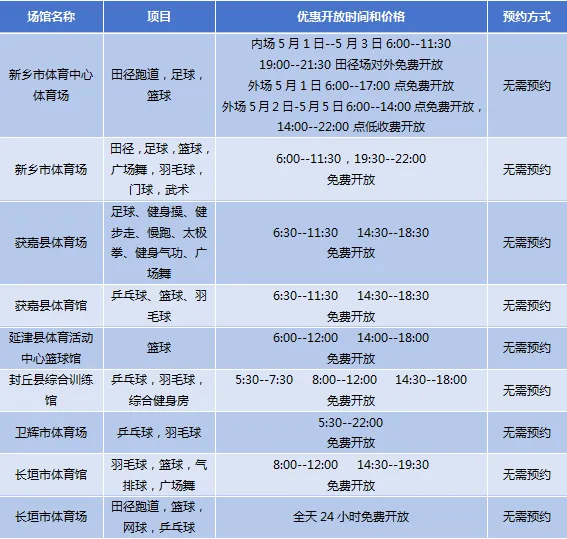 新乡市共有新乡市体育中心体育场、新乡市体育场、获嘉县体育场、获嘉县体育馆、延津县体育活动中心篮球馆、封丘县综合训练馆、卫辉市体育场、长垣市体育馆、长垣市体育场等9个场馆面向市民免低收费开放。