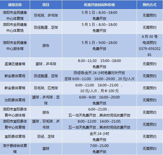 洛阳市共有洛阳市全民健身中心体育馆、洛阳市全民健身中心体育场、洛阳市全民健身中心游泳馆、孟津区健身馆、新安县体育场、新安县体育馆、汝阳县体育场、洛阳市宜阳县体育中心游泳馆、洛阳市宜阳县体育中心体育馆、宜阳县体育场、洛宁县综合体育馆等11个场馆面向市民免低收费开放。