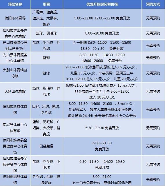 信阳市共有信阳市体育场、信阳市罗山县体育中心体育馆、光山县盛湾公园全民健身中心、光山县体育服务中心体育馆、大别山体育馆游泳馆、大别山体育馆、信阳市新县体育馆、商城县体育中心体育馆、信阳市淮滨县全民健身中心体育场、信阳市淮滨县全民健身中心体育馆、信阳市息县体育馆等11个场馆面向市民免低收费开放。