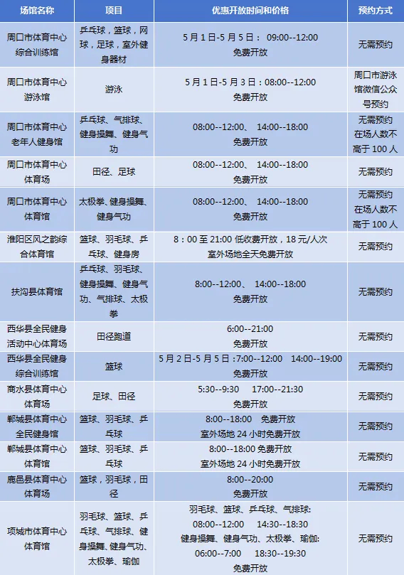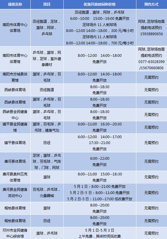 驻马店市确山县体育馆、确山县同力体育场等2个场馆面向市民免低收费开放。