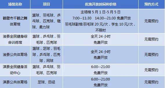鹤壁市共有鹤壁市千鹤之舞体育馆、浚县全民健身综合训练馆、浚县公共体育场、淇县全民健身活动中心、淇县公共体育场等5个场馆面向市民免低收费开放。
