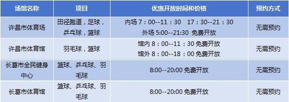 许昌市共有许昌市体育场、许昌市体育馆、长葛市全民健身中心、长葛市体育馆等4个场馆面向市民免费开放。