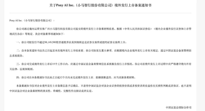 近日,证监会发布关于Pony AI Inc.(小马智行股份有限公司)境外发行上市备案通知书。