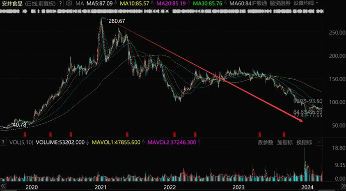 从2021年年初的280元以上到今年2月初的68元附近,昔日超级大牛股安井食品陷入了漫漫熊途当中,股价跌幅高达75%以上,腰斩再腰斩。