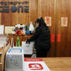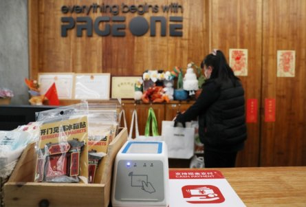 4月29日,在PAGEONE(北京坊店)书店收银台粘贴着支持现金支付的标识。