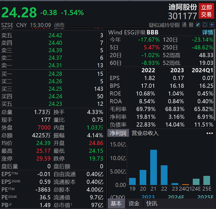 二级市场上,截至4月30日收盘,迪阿股份跌1.54%,报24.28元/股,股价较去年1月时相对高点已跌去65.77%。