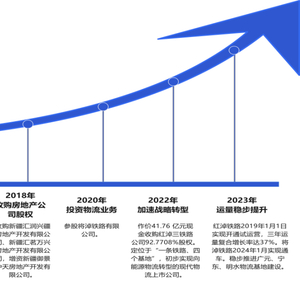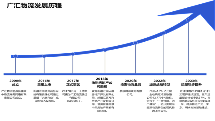 2016年12月,新疆亚中物流商务网络有限责任公司通过重组“大洲兴业”成功登陆A股市场。2017年正式更名为广汇物流股份有限公司(证券代码:600603.SH)。2019年起,广汇物流承诺未来不再新增商品房开发项目,转型布局能源物流业务。2020年参股18.92%建设将淖铁路,2022年收购新疆红淖三铁路有限公司92.7708%股权,在“疆煤外运”的大背景下,一举打通新疆铁路“一主两翼”战略的“北翼通道”。截止2023年12月31日,广汇物流实现营收49.32 亿元、净利润 6.38亿元、总资产235.09亿元。