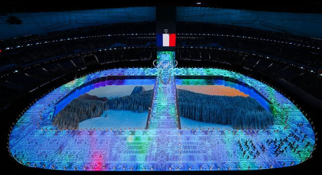 ↑2022年2月4日,法国代表团在北京冬奥会开幕式上入场。