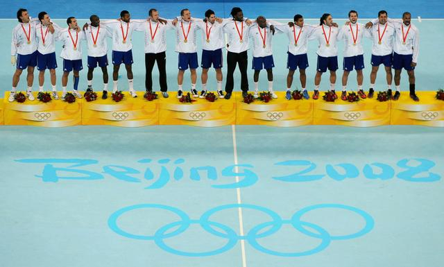 ↑2008年8月24日,法国队球员在北京奥运会男子手球冠军领奖台上高唱国歌。