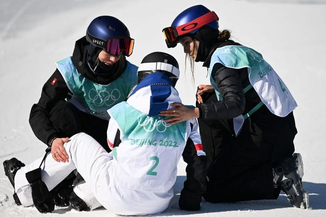 ↑2022年2月8日,中国选手谷爱凌(右)和瑞士选手玛蒂尔德·格雷莫德(左)在北京2022年冬奥会自由式滑雪女子大跳台决赛后安慰法国选手泰丝·勒德。