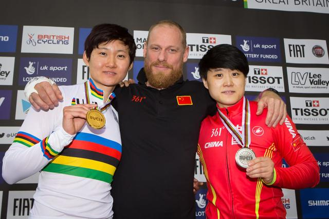 ↑2016年3月6日,中国队选手钟天使(左)、钟俊红(右)在2016场地自行车世锦赛女子竞速赛决赛后与法国籍教练伯努瓦·韦蒂合影。