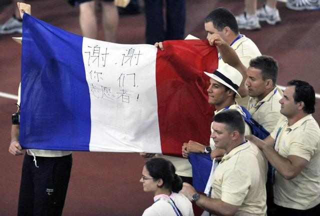 ↑2008年9月17日,法国代表团在北京2008年残奥会闭幕式上举着写有“谢谢你们志愿者”的国旗入场。