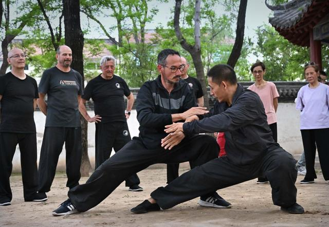 1400公里外河南温县陈家沟杨露禅学拳处来自法国波尔多的陈少拳向中国师父陈自强拜师学艺带领一批法国学员练习太极拳