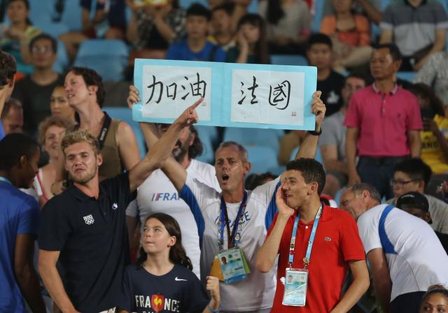 ↑2014年8月25日,一名法国观众在南京青奥会田径项目男子标枪决赛场边高举用中文书写的“加油法国”标语为法国选手卢卡斯·穆塔德加油。