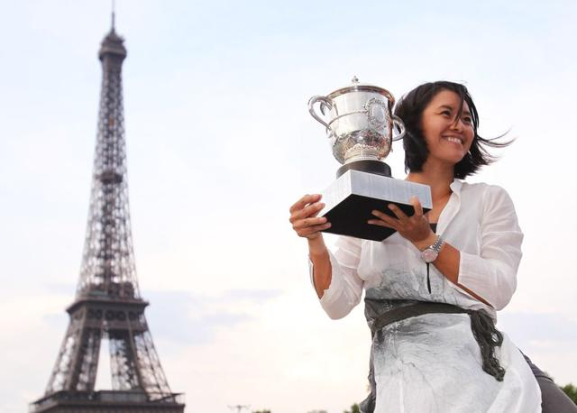 ↑2011年6月4日,李娜手捧冠军奖杯在埃菲尔铁塔附近留影。