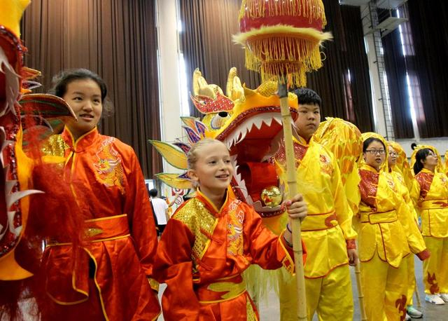 ↑2016年6月9日,上海向明初级中学的学生、法国女孩凯米(左二)在学校龙狮队中担任引狮人的表演任务。