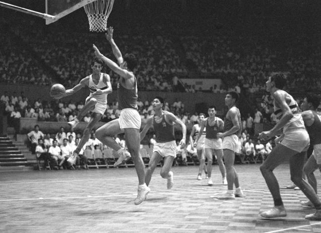 ↑1966年7月31日,法国男子篮球队同中国男子篮球队在北京工人体育馆进行访华首场友谊赛。