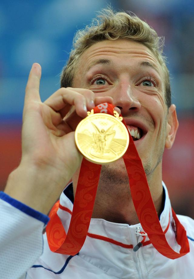 ↑2008年8月14日,法国选手阿·贝尔纳在北京奥运会男子100米自由泳颁奖仪式后展示金牌。