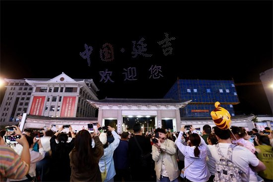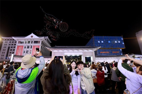 5月1日晚,千架无人机在延边大学校园上空编队表演,网红墙下人山人海。
