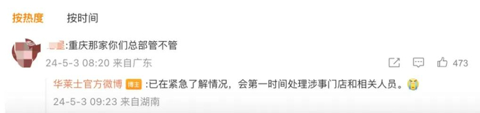 5月3日,茶百道就“点外卖变白水”事件发布声明后,华莱士官方微博在回应网友评论时表示,已在紧急了解情况,会第一时间处理涉事门店和相关人员。