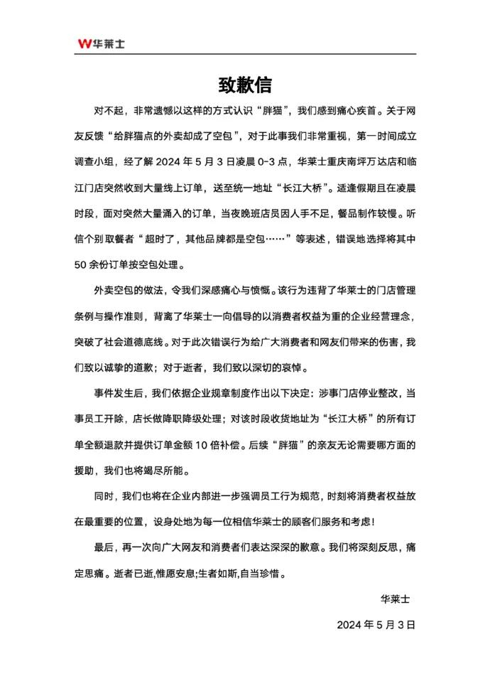 随后,华莱士官方微博发布致歉声明,称已将涉事员工开除,涉事门店停业整改。