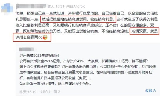 这也能解释泸州老窖借款100亿,然后又存到了银行,没有购买理财产品、或做其他投资,这种看起来似乎违反常理的行为。