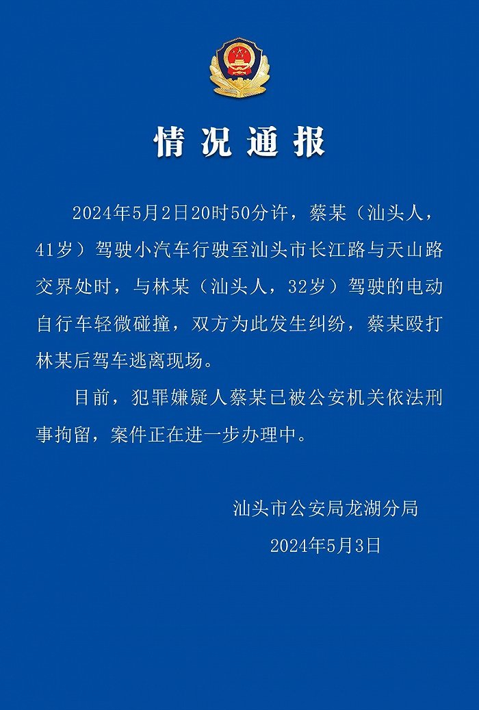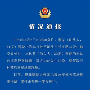 5月2日,网传广东汕头一奔驰车主撞人后还打人的视频引发关注。汕头市公安局龙湖分局5月3日通报,5月2日20时50分许,蔡某(汕头人,41岁)驾驶小汽车行驶至汕头市长江路与天山路交界处时,与林某(汕头人,32岁)驾驶的电动自行车轻微碰撞,双方为此发生纠纷,蔡某殴打林某后驾车逃离现场。目前,犯罪嫌疑人蔡某已被公安机关依法刑事拘留,案件正在进一步办理中。