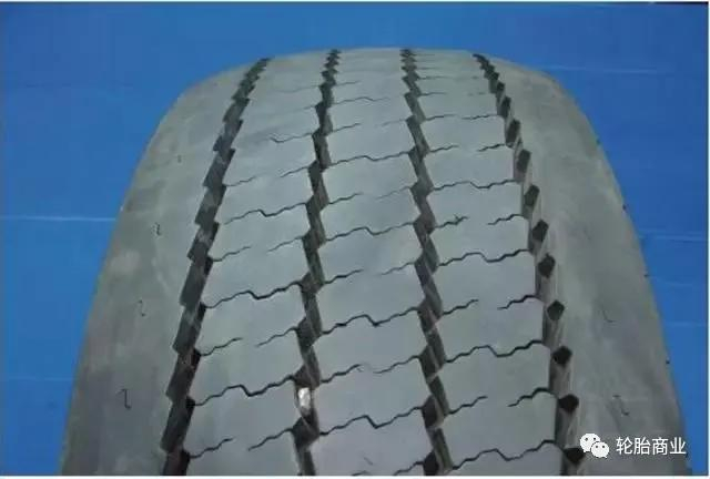 特征:与抬肩花纹相比,胎面中部花纹周向过度磨损。