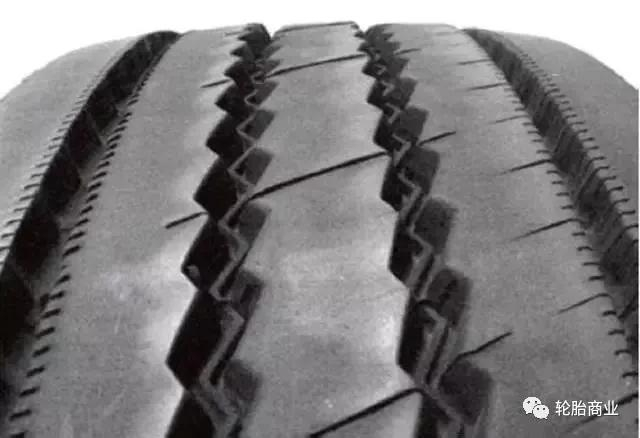 特征:胎面花纹全圆周或单侧直花纹及细花纹尾端呈羽毛状磨损。