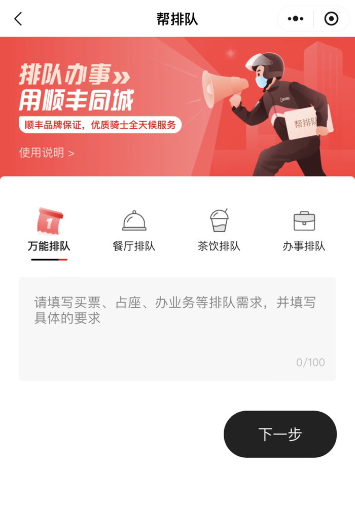 此外,也有平台提供类似的代排服务。例如,顺丰同城小程序上便推出“帮排队”服务。该小程序宣传称,“当您需要排队办事,自己又没有时间时,可以召唤顺丰同城急送的小哥帮忙,小哥可根据您的时间、地点以及要求完成服务。”