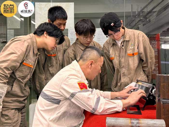 4月24日,陕西铁路工程职业技术学院焊接实训基地里,弧光四射、火花飞溅,身穿一身利落工装的叱培洲操作娴熟,正指导智能焊接技术专业大二学生惠兴琦完成细之又细的焊接任务。