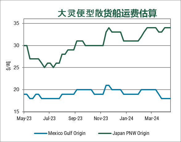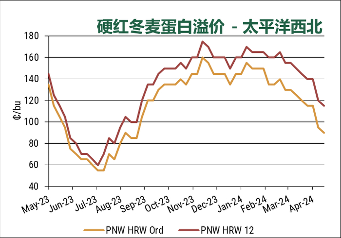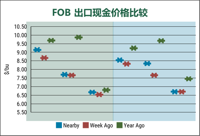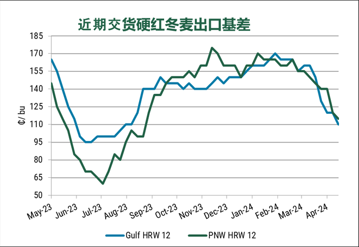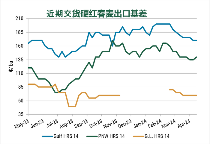 本周各类型小麦基差涨跌不一。墨西哥湾地区的硬红春基差持平,太平洋西北地区硬红春基差上涨,而两个出口地区的硬红冬基差均下跌。本周结束时的反弹刺激了更多农民出售冬小麦。软红冬麦基基差下降了5 美分,而软白麦价格保持稳定。