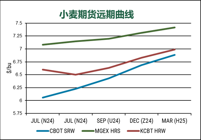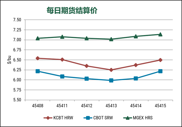 由于市场更多关注于天气情况对北半球作物的影响,本周小麦期货市场收盘涨跌互现。2024年7月CBOT软红冬麦(SRW)期货价格价格持平,收于$6.22/蒲式耳;KCBT硬红冬麦(HRW)跌4美分,收于6.50美元/蒲式耳;MGEX硬红春麦(HRS)涨11美分,收于7.14美元/蒲式耳。CBOT玉米涨10美分,收于4.60美元/蒲式耳。CBOT大豆涨38美分,收于12.15美元/蒲式耳。