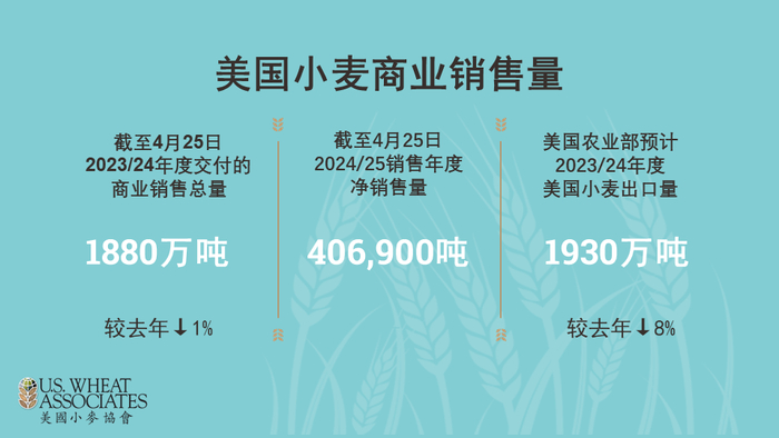 美国农业部出口销售周报显示,截至4月25日当周,2023/24年度交货的美国小麦商业净销售量为-20,300 吨,符合-100,000至100,000吨的贸易预期。2023/24年度迄今为止的商业销售总量为1880万吨。美国农业部预计2023/24年美国小麦出口量为1930万吨,迄今为止完成97%。而2024/25销售年度目前已知所有类型小麦未交付和累计出口总量255万吨,比去年增长98%,净销售额达到406,900吨。