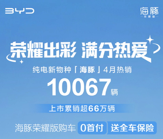纯电新物种“海豚”,4月热销10067辆,上市以来累计销售超过66万辆。海豚荣耀版5月份还推出了“0首付+购车送全车保险”的促销活动。