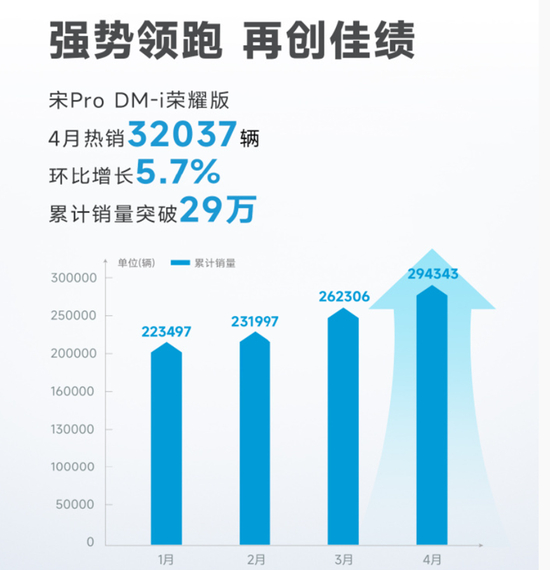 宋Pro DM-i荣耀版强势领跑,再创佳绩:4月热销32037辆,累计销量突破29万辆。