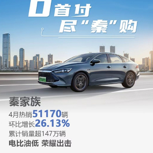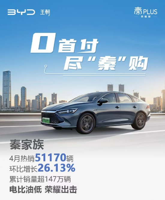 5月4日,比亚迪官微发布的最新销量数据显示,比亚迪秦家族4月热销51170辆,累计销量突破147万辆。