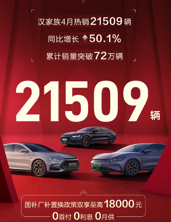 汉家族4月热销21509辆,同比增长50.1%。同时,汉家族还推出优惠购车政策,包括国家补贴以及比亚迪补贴,单车置换补贴至高18000元。