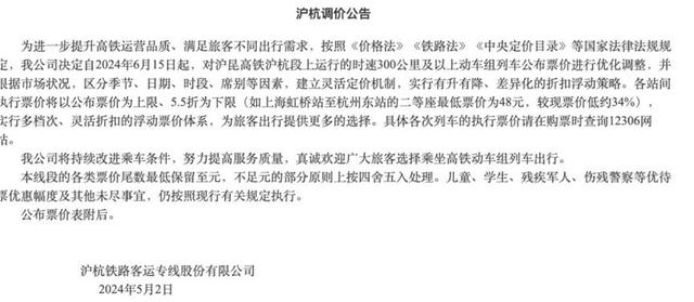 值得注意的是,近期,武广高铁、沪杭客专、沪昆客专、杭甬客专4条高铁线宣布,票价将于6月开启涨价窗口。