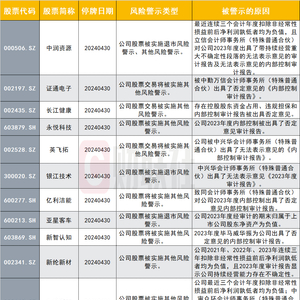 ifind数据显示,4月30日至少有40家上市公司宣布停牌,其中公告将被实施退市风险警示或其他风险警示的上市公司达40家,上述个股将在5月6日变更简称,被实施退市风险警示的个股还将“带星”。值得一提的是,这些股票中不乏中润资源、永悦科技、英飞拓等此前的热门股。