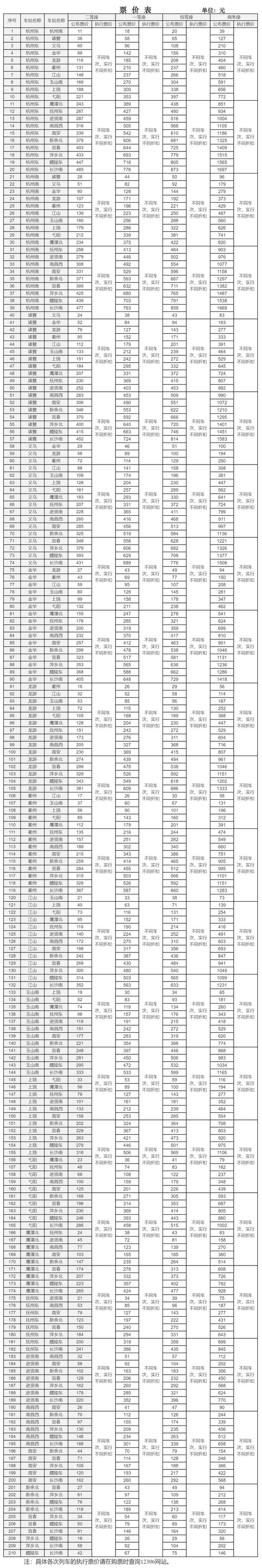 沪昆高铁杭长段票价表