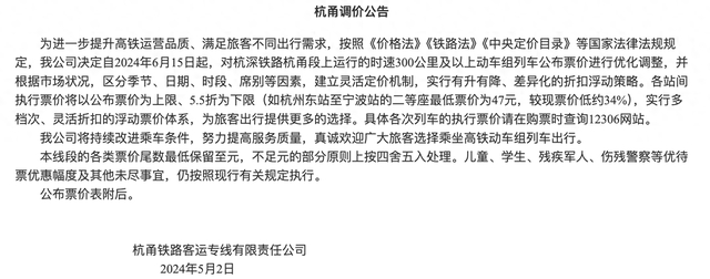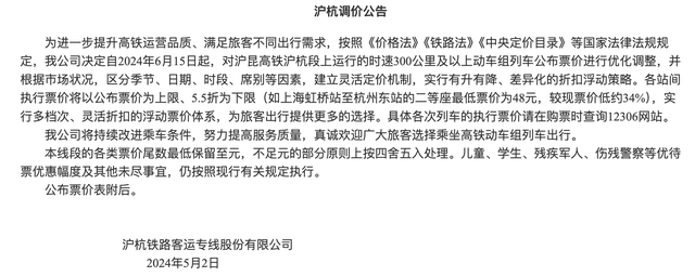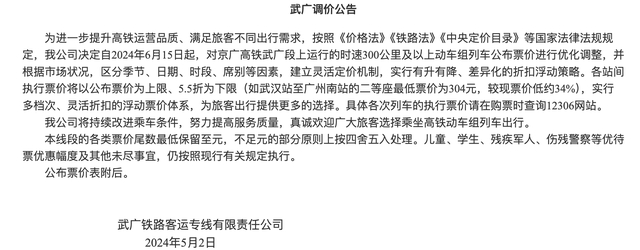 近日,铁路12306官网发布四则调价公告。公告指出,为进一步提升高铁运营品质、满足旅客不同出行需求,决定自2024年6月15日起,对京广高铁武广段、沪昆高铁沪杭段、沪昆高铁杭长段、杭深铁路杭甬段上运行的时速300公里及以上动车组列车公布票价进行优化调整,并根据市场状况,区分季节、日期、时段、席别等因素,建立灵活定价机制,实行有升有降、差异化的折扣浮动策略。