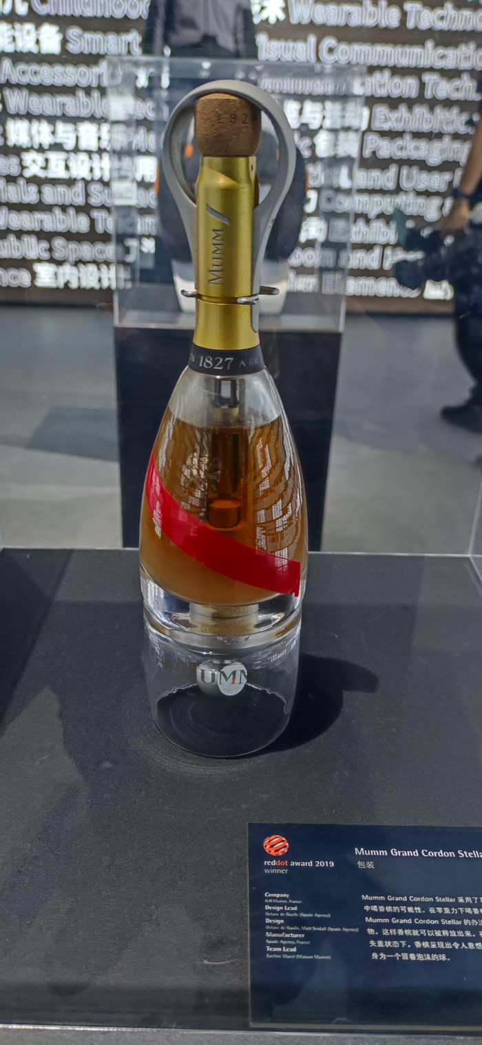 一件名为“包装”的作品,看似一瓶普通香槟,实则大有玄机:这是一瓶可以在太空中畅饮的香槟。革命性的玻璃瓶体和开启装置,让失重状态下的香槟变身为一个冒着泡沫的球,漂浮在空气中不会四处飞溅,直至被一个定制的玻璃杯接住。