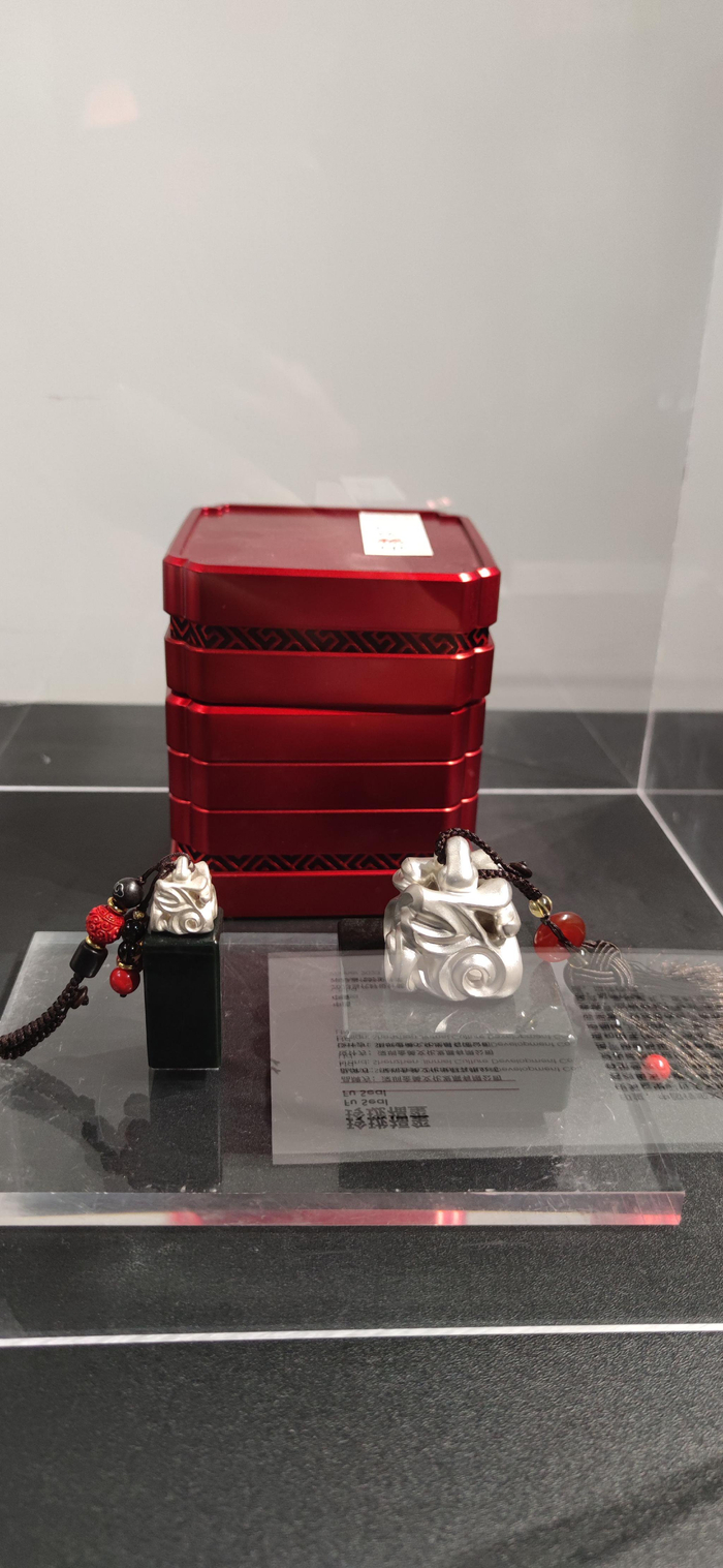 中国品牌自然不乏中国元素。一件“玲珑福玺”,以太湖雅石结构为灵感,融合圆雕、浮雕、透雕等传统工艺技法,创意巧制立体玲珑“福”字,足银铸造成钮,搭配通体青绿的和田玉为身,温润喜人。