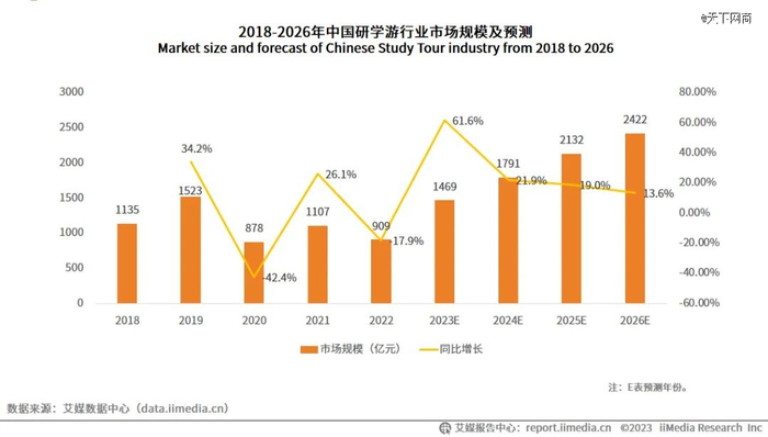 艾媒咨询数据显示,2022年中国研学游行业市场规模达909亿元,2023年市场规模或达1469亿元,同比增长61.6%,预计2026年将达到2422亿。千亿规模的蓝海市场,吸引了不少企业、资本的涌入。大到新东方文旅、OTA平台、教培机构,小到地方旅行社,都在接连布局研学游市场。