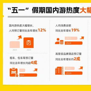 飞猪《2024“五一”假期出游快报》显示,境内游在游玩方式、服务内容、目的地选择等方面,纵深明显增加。从人均预订量看,今年“五一”同比增长12%,其中用车、酒店、线路游等服务人均预订量增幅更明显,线路游预订量同比增长约三成。