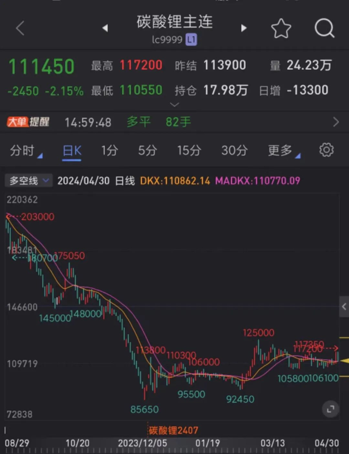 4月29日,主力合约LC2407一度上涨5.65%至115900元/吨,但4月30日短暂冲高后快速回落,截至当日收盘,LC2407报收111450元/吨,下跌2.15%。