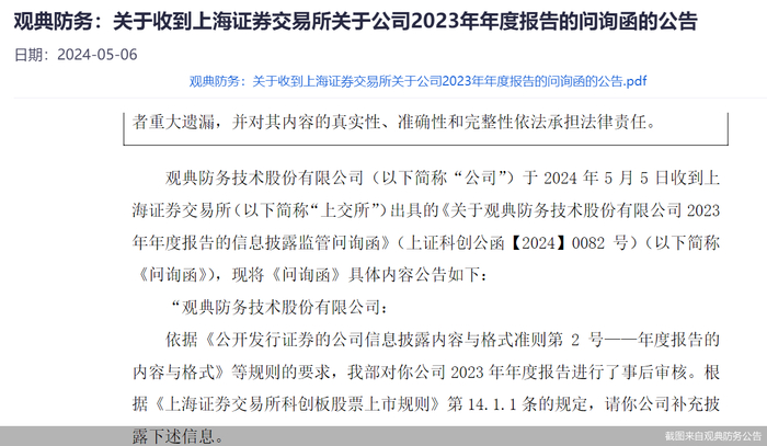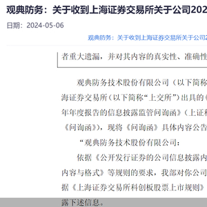 需要指出的是,“五一”假期前,观典防务刚收到上交所下发的问询函。