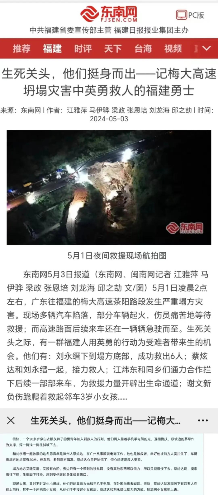 5月1日2时许,广东梅州市梅大高速茶阳路段发生塌方灾害,漳州00后蔡炫达与刘永缙上演一场接力式救援。