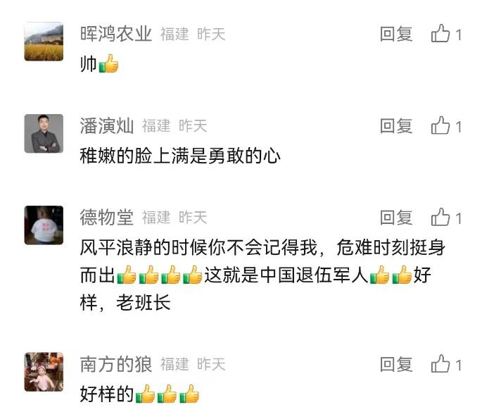 “风平浪静的时候你不会记得我,危难时刻挺身而出,这就是中国退伍军人,好样,老班长。”